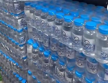 Zam-Zam — питьевая вода в индивидуальных бутылках с синими крышками, упакованных в термоусадочную пленку (мультипак). На этикетке указано «Zam-Zam», оформление с водной графикой. Бутылки компактног...