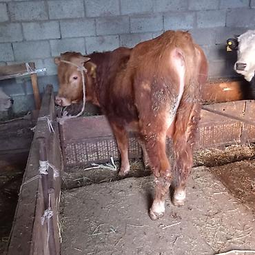 Телёнок (бычок), мясного направления. Окрас красно‑бурый с белой головой и белыми отметинами на ногах и груди. Возраст визуально молодой. Содержится на привязи в стойле. Плотное телосложение, разви...