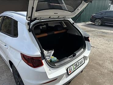 Электромобиль BYD e2 хэтчбек-кросс, белый цвет кузова, черные литые диски. Задняя светодиодная линия, спойлер, тонированные стекла. Зарядный лючок слева, задний парктроник, камера заднего вида. Номерной знак KG на фото.