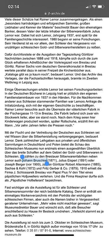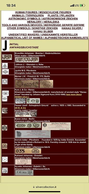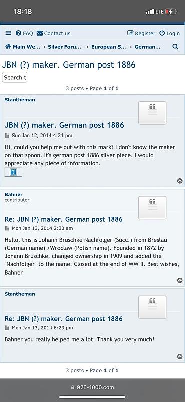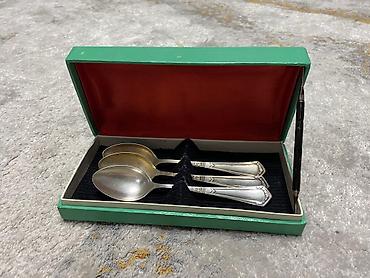 Набор из трёх чайных ложек в оригинальной коробке. Луна с короной и контрольное клеймо «800» это гарантия немецкой пробирной палаты и качества не ниже 800 пробы серебра. Также имеется клеймо мастера «JBN». Johann Bruschke Nachfolger из Бреслау (Вроцлав, Польша) — важного промышленно-ремесленного центра тогдашней Нижней Силезии. Историческая справка фиксирует основание предприятия в 1872 г., позднее в 1909 г. фирма сменила структуру управления и стала отмечаться приставкой Nachfolger; производство сохранялось вплоть до конца Второй мировой войны.