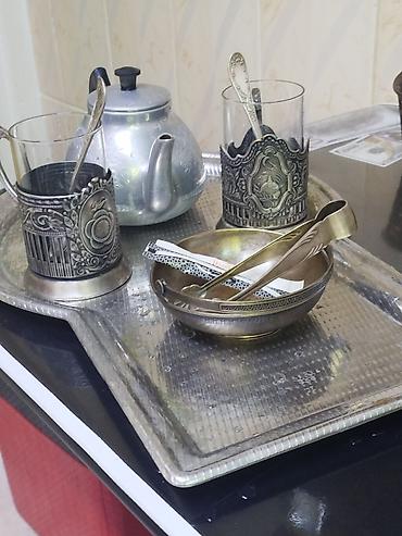 Материалы: металл (алюминий/сплав на чайнике, латунь на подносе, подстаканники и аксессуары — мельхиор с тиснением), стекло.