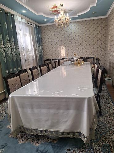 - Кухня: навесные глянцевые шкафы с ручками-скобами, рабочая зона с фартуком «под плитку», мойка, столешница, место под технику, стиральная машина, большой обеденный стол с комплектом стульев.