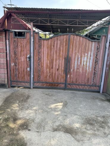 - Въездные распашные ворота из металла с деревянной облицовкой и декоративными коваными элементами; рядом отдельная калитка. Широкий бетонный проезд позволяет заезжать автомобилям.