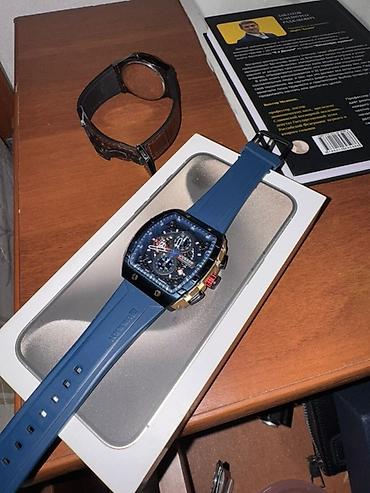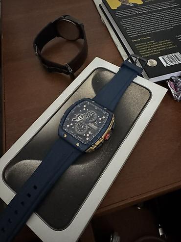 - Циферблат: синий, скелетонизированный стиль с метками и винтами по периметру; три функциональных малых циферблата, центральная секундная стрелка.