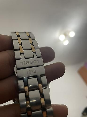 - Браслет с центральными золотистыми звеньями, фирменная застёжка Tissot с гравировкой «TISSOT 1853».