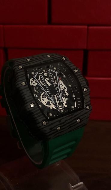 - Корпус прямоугольной формы с изогнутыми гранями, выполнен в черно‑сером «слоистом» карбоновом стиле; по безелю — декоративные винты в форме звезд.