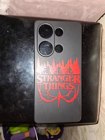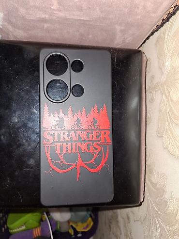 - Дизайн: красный принт Stranger Things с лесом и велосипедистами