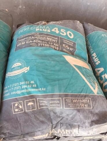 Портландцемент 450, мешки по 50 кг. - Бренды на фото: Standard Cement и Jambyl Cement (Performa Plus 450). - Тип: портландцемент (композиционный). - Класс прочности: 32,5 Н (указано как ЦЕМ II/А-Ш...