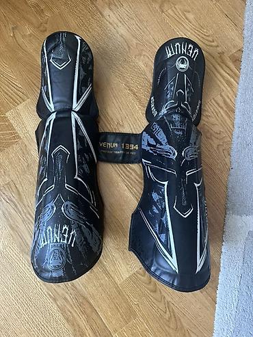 - Защита голени и подъема стопы VENUM (серия с графикой «рыцарь/шлем»), черная с белыми элементами. Усиленные панели на голени и стопе, жесткая чашка голеностопа, регулируемые ремни на липучках для плотной посадки. Легкие, хорошо амортизируют удары ногами и блоки, не сковывают движение.
