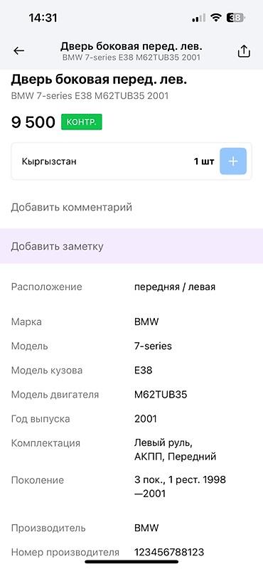 BMW Бмв e38 е38 Предлагается черная передняя левая дверь для автомобиля. Дверь укомплектована боковым зеркалом и дверной ручкой. Предназначена для замены поврежденной или изношенной двери на соответствующей модели автомобиля. Элемент кузова, который обеспечивает доступ в салон и защиту пассажиров. Может использоваться для восстановления внешнего вида или функциональности транспортного средства.