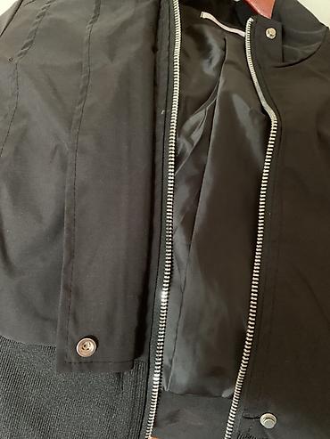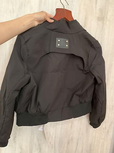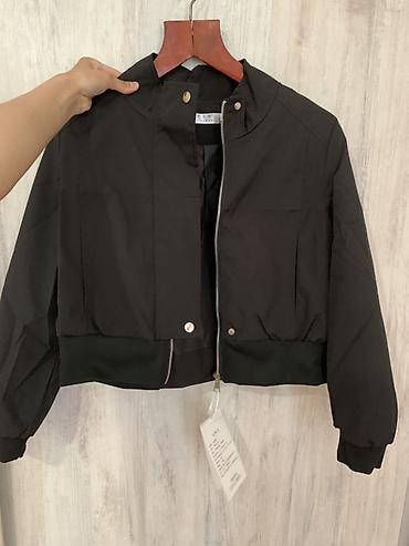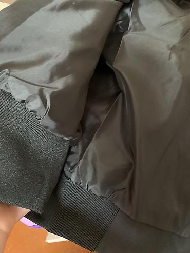 Чёрная укороченная куртка-бомбер - Прямой силуэт, длина по талии - Застёжка на металлическую молнию + планка на кнопках - Высокий воротник-стойка с кнопками - Эластичные трикотажные манжеты и широ...