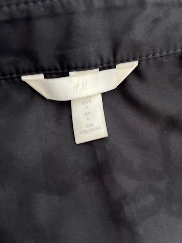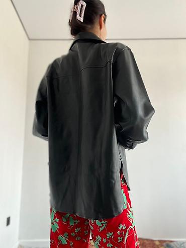 Черная женская рубашка из искусственной кожи от H&M. Модель имеет классический воротник, длинные рукава с манжетами на пуговицах и застежку на пуговицы спереди. Рубашка универсальна и подойдет для различных образов, создавая стильный и современный вид.