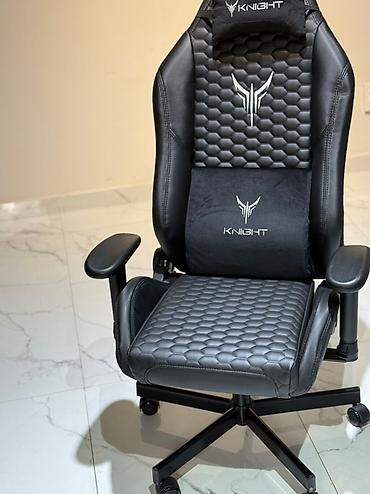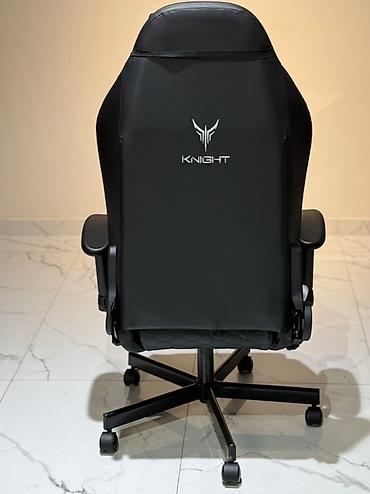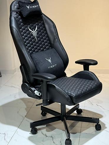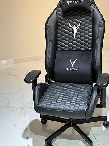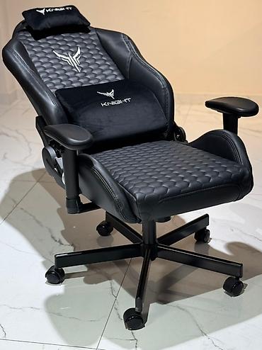 Эргономичное игровое кресло Knight черного цвета с подголовником и поясничной подушкой. Обивка выполнена из комбинации гладкой и текстурированной экокожи с ромбовидным узором, обеспечивая комфорт и долговечность. Кресло оснащено регулируемыми подлокотниками и пятилучевой опорой с колесиками для легкого перемещения. Логотип "Knight" присутствует на подголовнике и поясничной подушке, а также на спинке кресла. Идеально подходит для длительных игровых сессий или работы за компьютером.