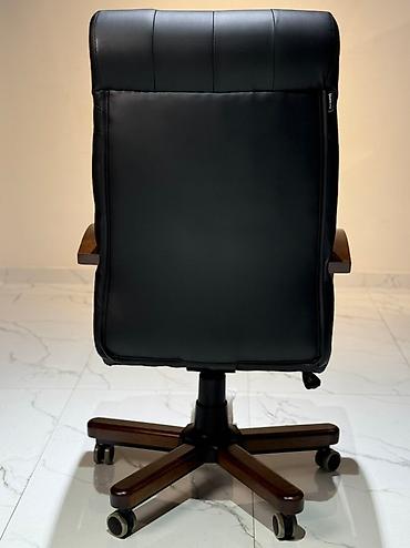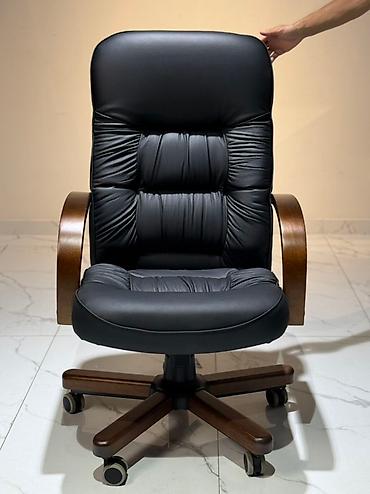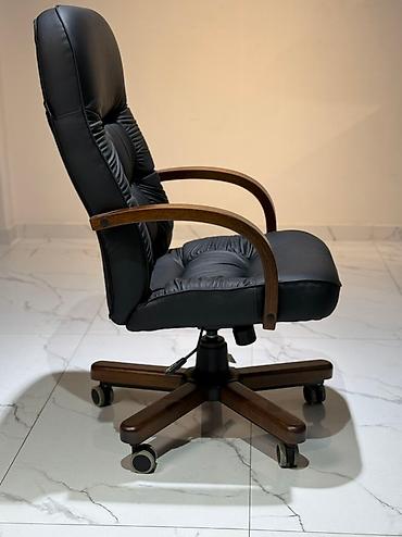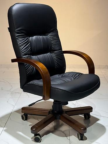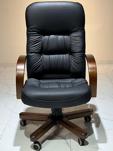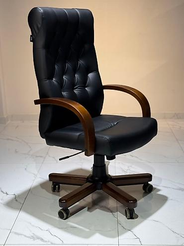Элегантное офисное кресло черного цвета с высокой спинкой и мягкими подлокотниками из дерева. Обивка выполнена из качественной кожи или экокожи, а спинка декорирована утяжками, создающими эффект капитоне. Кресло оснащено механизмом регулировки высоты, что позволяет настроить его под индивидуальные потребности. Устойчивое основание с пятью колесиками обеспечивает легкое перемещение по офису или дому, делая его удобным для длительной работы за столом. Это кресло станет функциональным дополнением для кабинета или рабочей зоны.