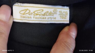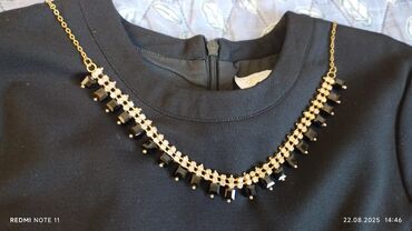 Элегантное черное платье от De Salitto в итальянском модном стиле. Платье оснащено короткой молнией на спине для удобства надевания и снятия. Воротник украшен декоративной цепочкой с мелкими черными и прозрачными бусинами, придающими изделию нарядный вид. Короткие рукава и подол платья отделаны тонкой золотистой каймой, добавляющей изысканности. Модель подходит для особых случаев или повседневного использования, обеспечивая комфорт и стиль.