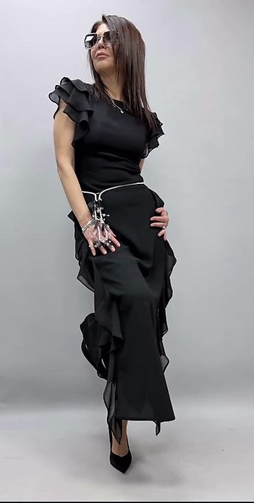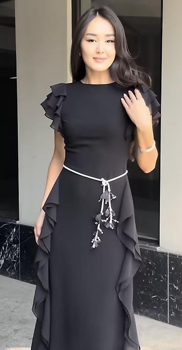 - Рекомендации по образу: лаконичные туфли-лодочки, клатч и минималистичные украшения — для акцента на воланах и поясе.