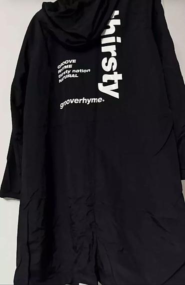 Также на фото: черная удлиненная ветровка-парка с капюшоном и крупным белым принтом “grooverhyme” на спине, свободный прямой крой. Цена плаща - 2600 с