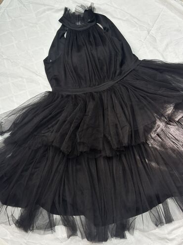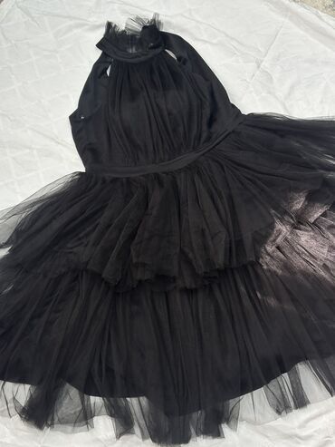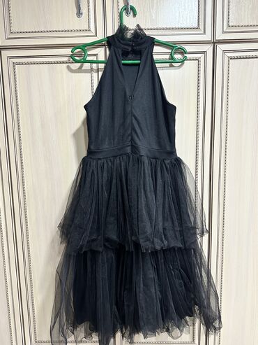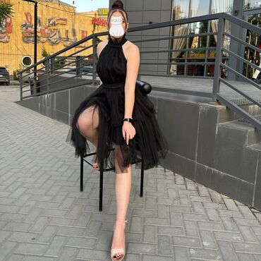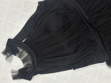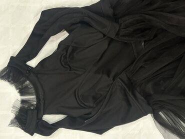 Элегантное черное платье с блестящим верхом. - Силуэт: расклешенный низ длины миди. - Верх: кружевная накидка-болеро с вышивкой и плотной россыпью сияющих страз по переду и сзади. - Рукава: 3/4 и...