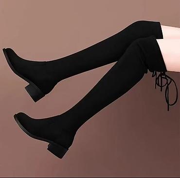 Замшевые ботфорты-чулки, черные. - Высота — выше колена, мягкий облегающий голенище. - Материал верха: бархатистая искусственная замша. - Подошва: низкий устойчивый каблук ~2–3 см, декоративная ок...