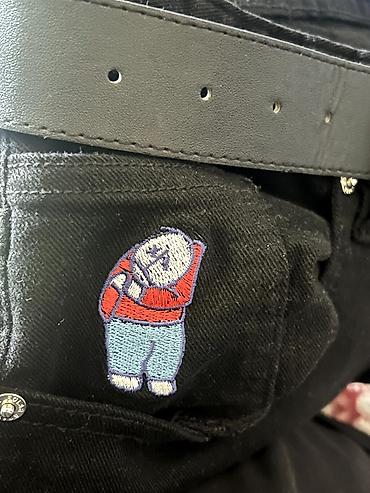 Джинсы BIG BOY — черные, прямого свободного кроя. - Контрастная белая прострочка по всем швам. - Пятикарманная конструкция: два передних кармана, монетница с вышивкой персонажа, два накладных кар...