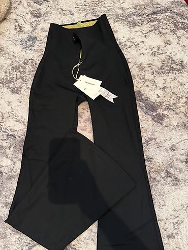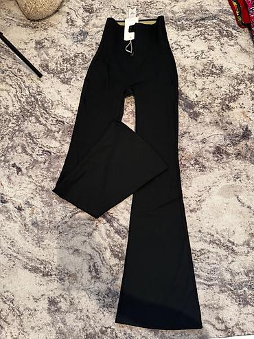 - Детали кроя: аккуратные продольные швы, ровные широкие штанины-клёш