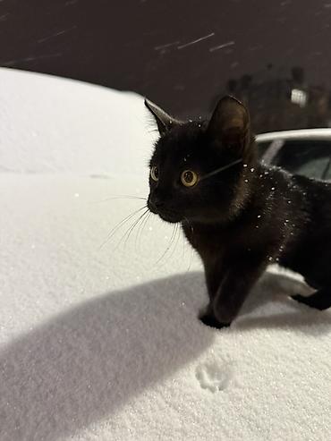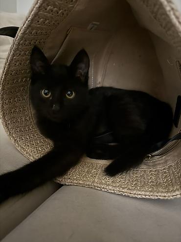 Маленький чёрный котёнок с янтарными глазами. Активный, любопытный, любит играть и исследовать новые места (домашние укрытия, сумки, коробки). Ласковый, быстро идёт на контакт, ориентирован на человека. Подходит для квартиры, хорошо переносит новые условия, аккуратный в быту.