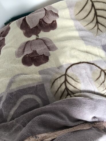 Дополнительно на фото — плед/покрывало из микрофлиса с цветочным рисунком в серо-бежевых тонах (мягкий, тёплый).