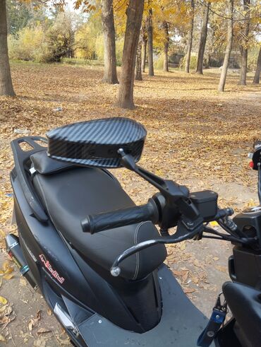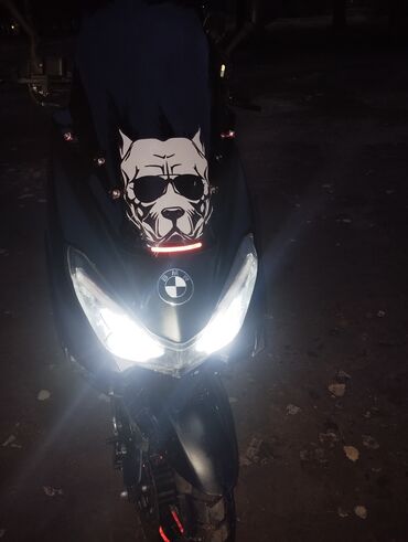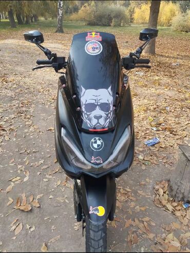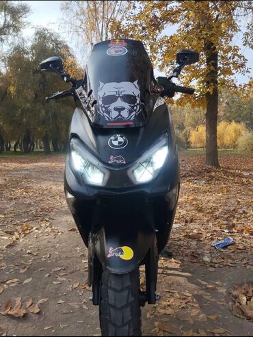 - Городской скутер с обвесом в стиле макси, высокий тонированный ветровик с наклейками.