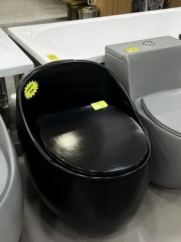 Черный напольный унитаз с овальной чашей и сиденьем. Модель имеет цельный корпус, что придает ей современный и элегантный вид. Белая внутренняя поверхность чаши контрастирует с черным внешним покрытием. Унитаз оснащен крышкой с механизмом плавного закрывания. Подходит для установки в ванных комнатах с современным дизайном.