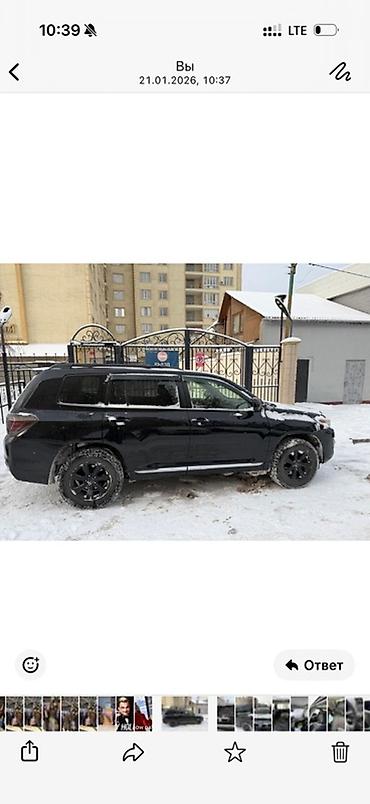 Черный внедорожник Toyota Highlander. Автомобиль оснащен рейлингами на крыше и темными тонированными стеклами, что придает ему стильный вид и обеспечивает дополнительную приватность. Установлены черные диски. Модель подходит для городской езды и путешествий, предлагая просторный салон и вместительный багажник.