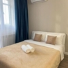 Стильные апартаменты с современным ремонтом - Просторная спальня с большой двуспальной кроватью, мягким изголовьем и комплектом белоснежного текстиля; прикроватные тумбы, настенные бра, плотные шт...