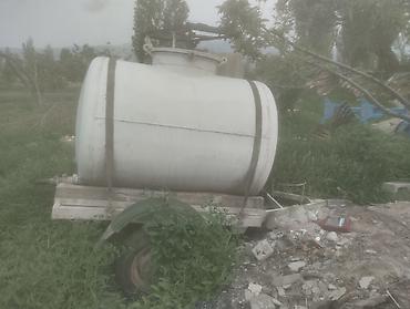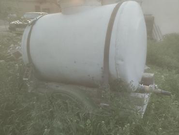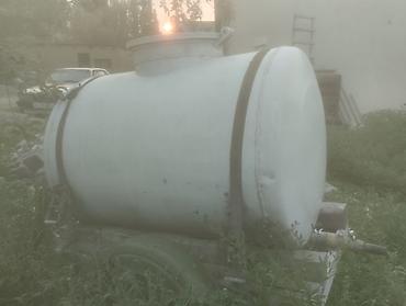 Металлическая цилиндрическая емкость на раме-прицепе. - Объем: ориентировочно 1–2 м³ (визуально по габаритам). - Конструкция: горизонтальная стальная бочка с плоскими торцами, установлена на мас...