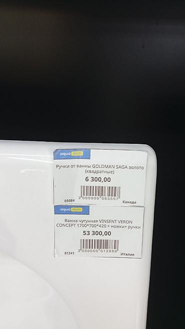 На фото ценник: 53 300,00 за ванну; отдельно указаны «Ручки от ванны GOLDMAN SAGA (квадратные) — 6 300,00». Производство: Италия.