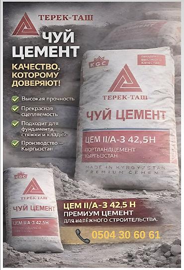 Чуйский цемент ТЕРЕК-ТАШ, марка М-450, цвет серый. адрес Биримдик кут доставка договорная ориентировочно гес 5 круговой сельсовет Характеристики: - Соответствие ГОСТ 30. - Упаковка: мешок 50±1 к...