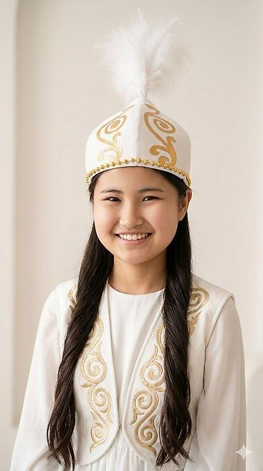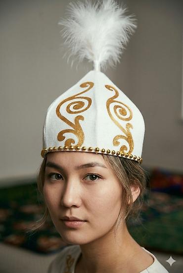 Традиционная шапка с кисточкой (восточно‑/центральноазиатский стиль) - Форма: высокая жесткая тюбетеяка/калпак с загнутыми полями. - Цвет и отделка: белый верх с контрастными черными кантами по шв...