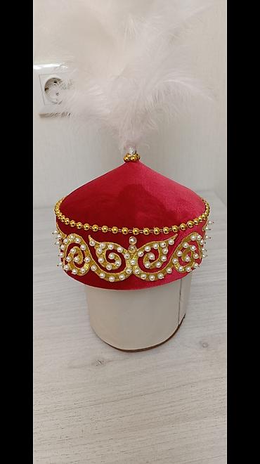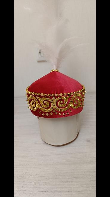 Традиционный детский тюбетейка/сәукеле (головной убор) для национальных праздников и фотосессий. - Материал верха: бархат насыщенного красного цвета. - Декор: золотой тесьмой, бусинами под жемчуг ...