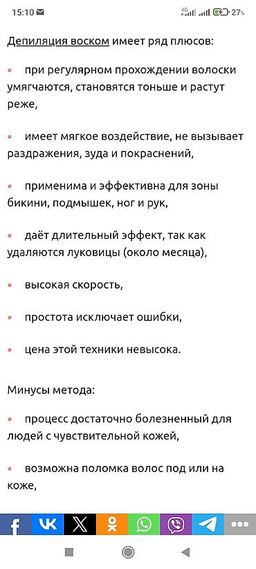 Депиляция с выездом на дом, Бишкек. Только женщины! Предлагаются все виды депиляции: - ваксинг (воск) - шугаринг (сахарная паста) - картриджные системы Индивидуальный подбор техники под ваш тип ко...