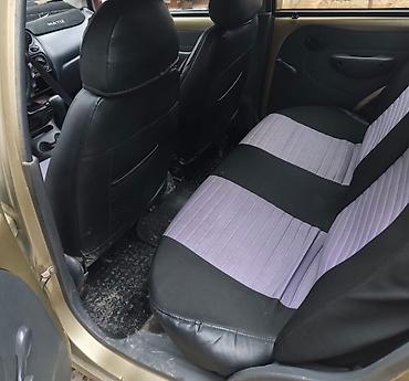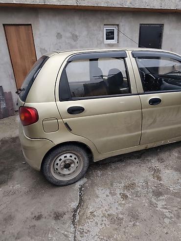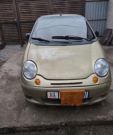 Daewoo Matiz, 5‑дверный городской хэтчбек, золотистый цвет кузова. Компактные габариты, экономичный двигатель. Салон на 4–5 мест, тканево‑эко‑кожаные чехлы на сиденьях, Автоматическая коробка передач, коврики-«ванночки» по всему салону. Задний ряд складывается для увеличения багажника. Снаружи: компактные круглые фары, передние противотуманные секции, повторители поворота в бампере, ветровики на окнах, задний стеклоочиститель. Отличный вариант для города: манёвренность, низкий расход топлива, простой и доступный в обслуживании автомобиль. Номера KG.