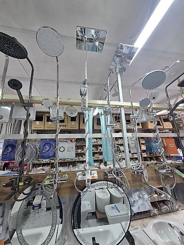 - Полный комплект для ванной: стойка, верхний душ «тропический» (квадратная/круглая лейка в зависимости от модели на стенде), ручная лейка, шланги, держатели.