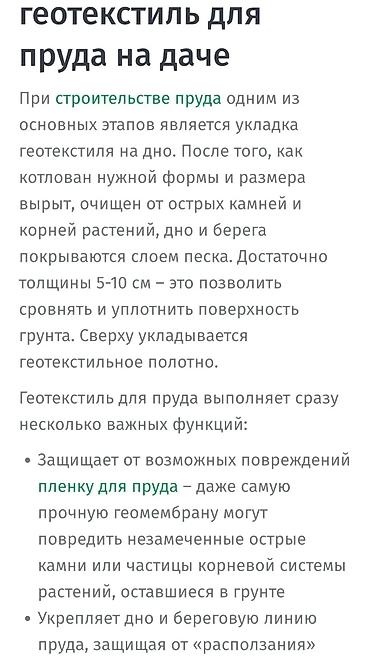 Пленка для пруда ПВД, толщина 0,5 мм, длина рулона 25 м, ширина 4 м. 100м2. Цена 350 сом/м2. Аппарат для сварки плёнки в аренду. Геотекстиль 300 г/м2-85с/м2. Описание: - Материал: ПВД (полиэтилен ...