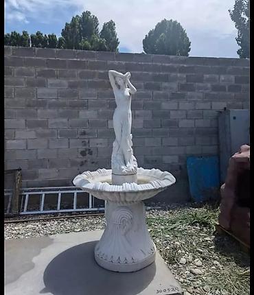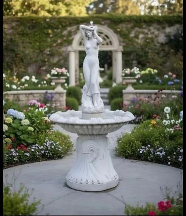 - Скульптурный фонтан с женской фигурой: чаша на массивной тумбе с рельефом, центральная статуя, подача воды из верхней точки.