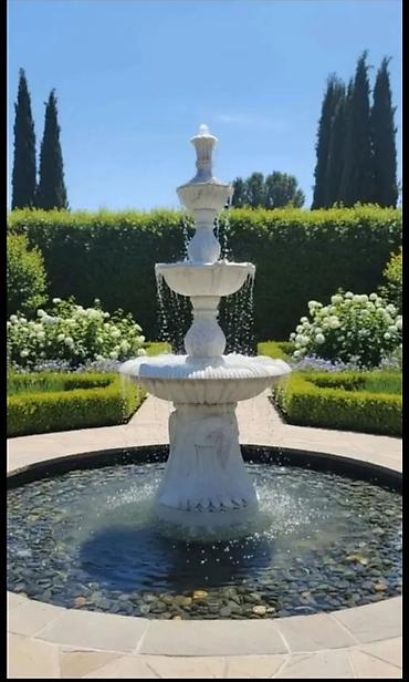 Фонтан из натурального мрамора. Высота 2, 30 метра, диаметр нижней чаши 1, 30 метра. - Материал: натуральный мрамор, светлый, с природной прожилкой. - Конструкция: многоярусный (3 чаши + верхний ф...