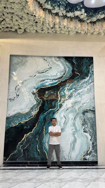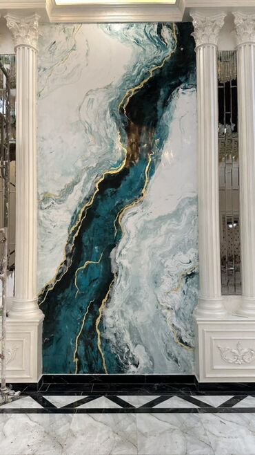 - Дизайн: мраморно-ониксовая фактура с выразительными прожилками бирюзово‑черного и белого цветов, акценты «золотых» линий. Рисунок стыкуется в единую композицию от секции к секции.