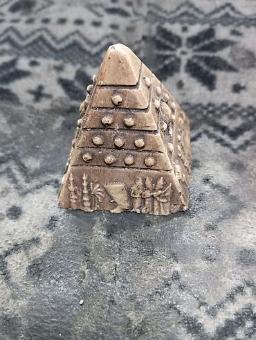 - Миниатюрная пирамидка с барельефами по граням. Материал и отделка в том же стиле; подходит как самостоятельный сувенир или парный декор к панели.