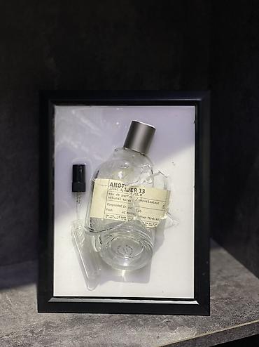 4) Le Labo Another 13 — прозрачный флакон с бежевой этикеткой на белой подложке; в комплекте закреплена мини‑пипетка/распылитель.