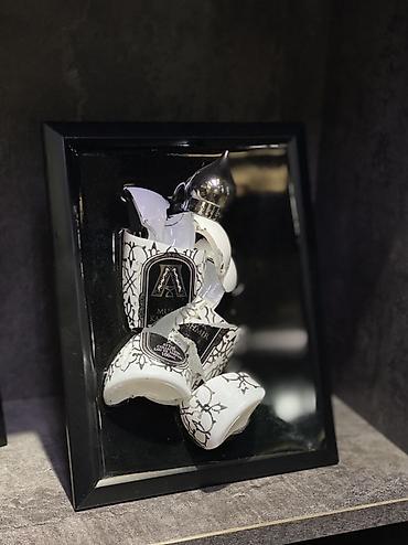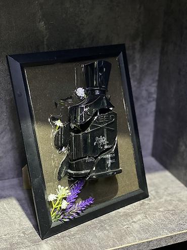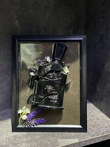 - Состав: разбитые и деформированные флаконы парфюмов, художественно зафиксированные на подложке и помещённые в раму под стеклом.