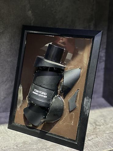 2–3) Tom Ford Ombre Leather — матово‑чёрный флакон, собран из фрагментов, контрастный тёмно‑коричневый фон.
