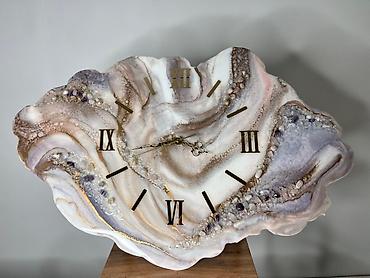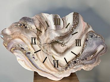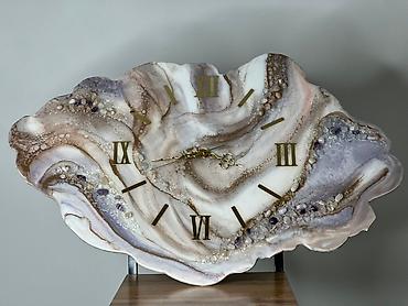 Декоративные настенные часы, выполненные в форме раковины из эпоксидной смолы. Часы отличаются уникальным дизайном с плавными переходами оттенков белого, бежевого, серого и лавандового, имитирующими природные узоры. Поверхность инкрустирована мелкими блестящими элементами, натуральные камни: розовый кварц, кальций, аметист, Горный хрусталь и стеклянная крошка , что придает изделию фактурность и блеск. Циферблат обозначен римскими цифрами в золотом цвете гармонирующими с общим стилем. Изделие станет выразительным акцентом в интерьере, подходящим для оформления гостиной, спальни или прихожей, добавляя изысканность и природную эстетику.