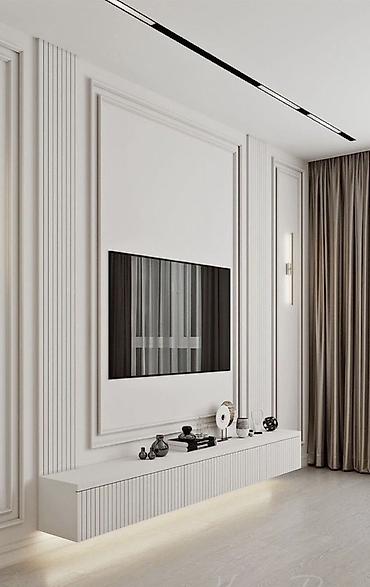- Вертикальные рейки, классические багеты/молдинги, интеграция ниш под ТВ и консольные тумбы