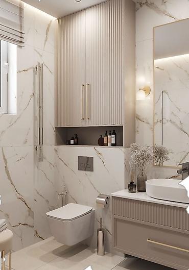 - Санузла: вертикальные фасады шкафов, декоративные панели тумбы, ниши над инсталляцией